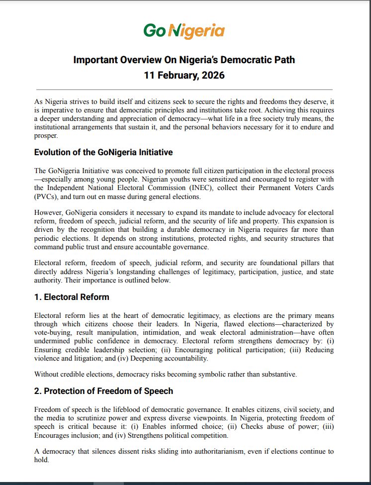 The GoNigeria Initiative has announced an expansion of its advocacy efforts, calling for broader reforms aimed at strengthening Nigeria’s democratic foundations beyond periodic elections.